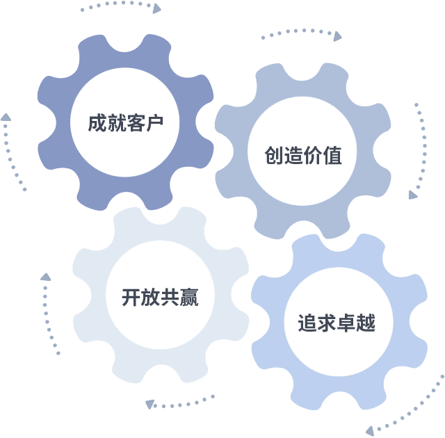 成就客户是一切决策的出发点,,创造价值是衡量所有工作的标准,,,追求卓越是我们做事做人的态度,,开放共赢是我们的格局也是最终的结果。。。价值观的齿轮环环相扣,,,,推动着组织里的每个人不断向前。。